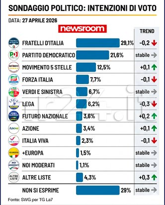 Il quadro politico delineato dall’ultimo sondaggio SWG per La7 del 27 aprile 2026 conferma una sostanziale stabilità degli equilibri, con variazioni contenute che tuttavia segnalano movimenti interessanti all’interno dei principali schieramenti. In testa resta saldamente Fratelli d’Italia, che si attesta al 29,1%, registrando una lieve flessione di due decimi rispetto alla rilevazione del 20 aprile, quando era al 29,3%. Un calo minimo che non intacca la leadership del partito di maggioranza relativa, ma che interrompe una fase di consolidamento.