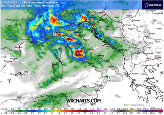 L’aspetto più rilevante di questa configurazione riguarda la possibile stazionarietà dei sistemi precipitativi. La lenta evoluzione del minimo depressionario potrebbe infatti determinare la persistenza dei fenomeni sulle medesime aree per diverse ore, se non giorni. In tali condizioni, le cumulate pluviometriche previste risultano particolarmente significative: si stimano accumuli diffusi tra 120 e 150 mm, con picchi locali che potrebbero raggiungere o superare i 200 mm, quantitativi equivalenti a oltre un mese e mezzo di precipitazioni concentrate in un intervallo temporale ristretto.