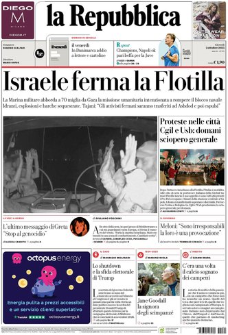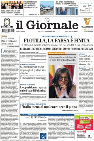 La giornata odierna si tinge di tensioni internazionali e ripercussioni nazionali, con gli eventi legati alla Flotilla che monopolizzano le prime pagine dei maggiori quotidiani italiani. A poche miglia da Gaza, la marina israeliana ha bloccato le navi cariche di attivisti, nel corso di un’operazione durata ore e condotta in acque internazionali, culminata con l’arresto degli equipaggi e l’imminente espulsione degli stessi. Israele, con un netto blitz, ha messo fine alla traversata della Flotilla, suscitando subito proteste in tutta Italia che si traducono in una mobilitazione sindacale nazionale annunciata per domani. Fra gli attivisti fermati spicca anche la presenza di Greta Thunberg, simbolo di una protesta che si intreccia tra diritti umani e politica internazionale.
