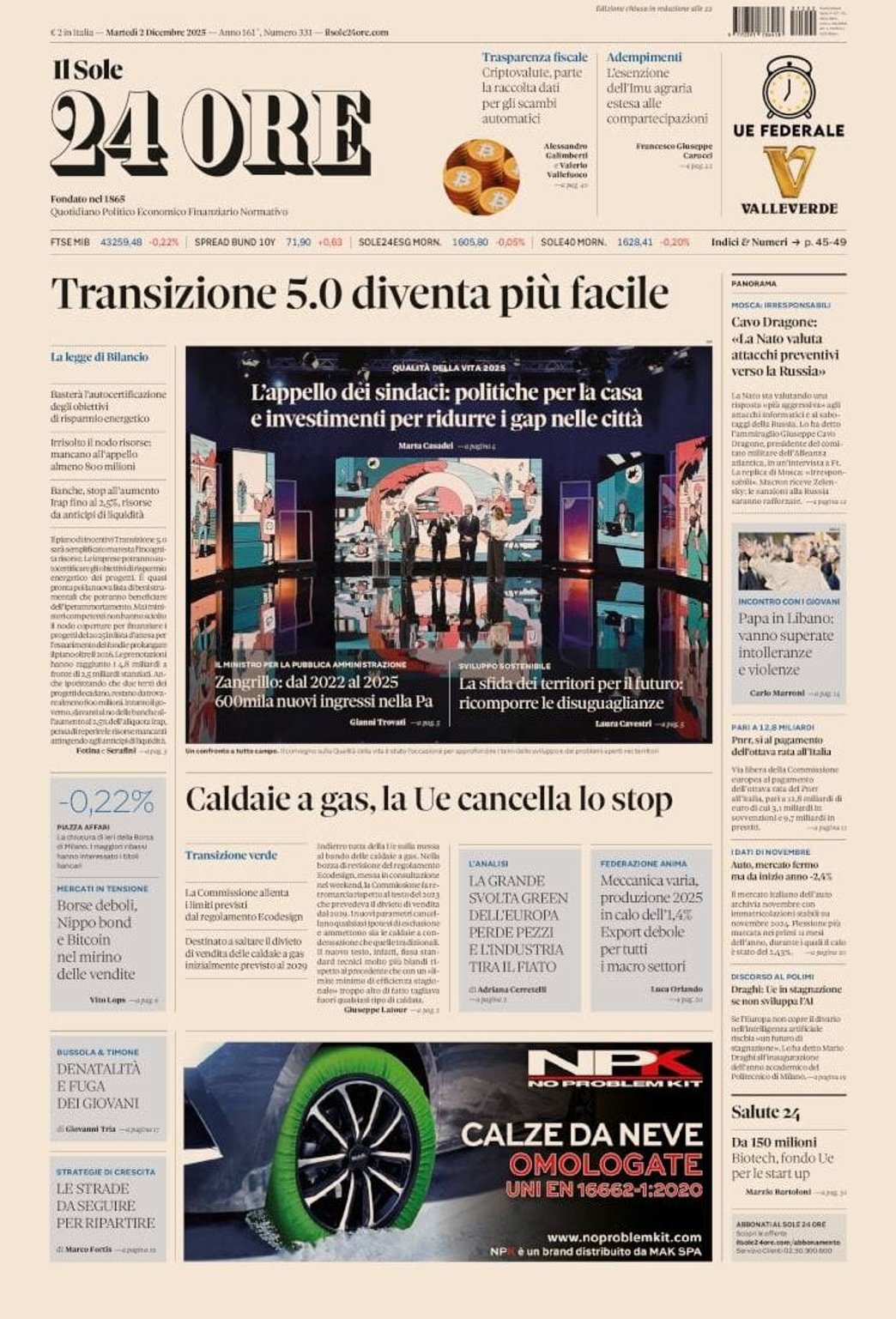 I Titoli Principali da Il Sole 24 Ore di oggi: