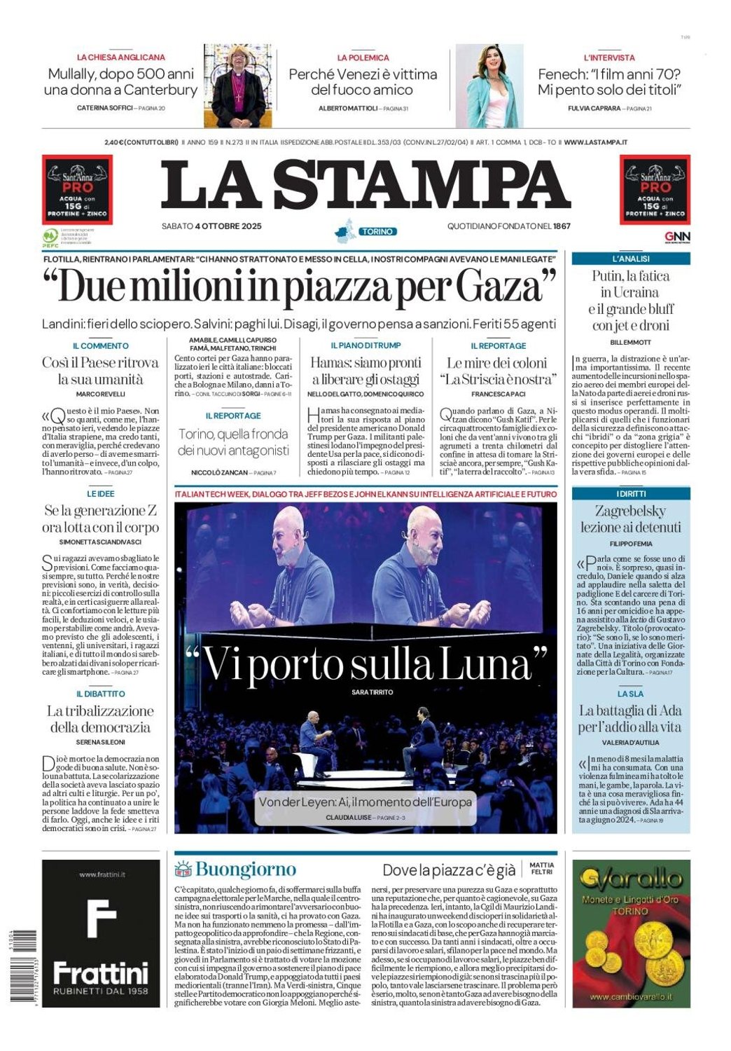 - Due milioni in piazza per Gaza - Landini: fieri dello sciopero – Amabile Camilli Carpisu, Fama Mantino Trinch – Il Piano Trump: Hamas: siamo pronti a liberare gli ostaggi