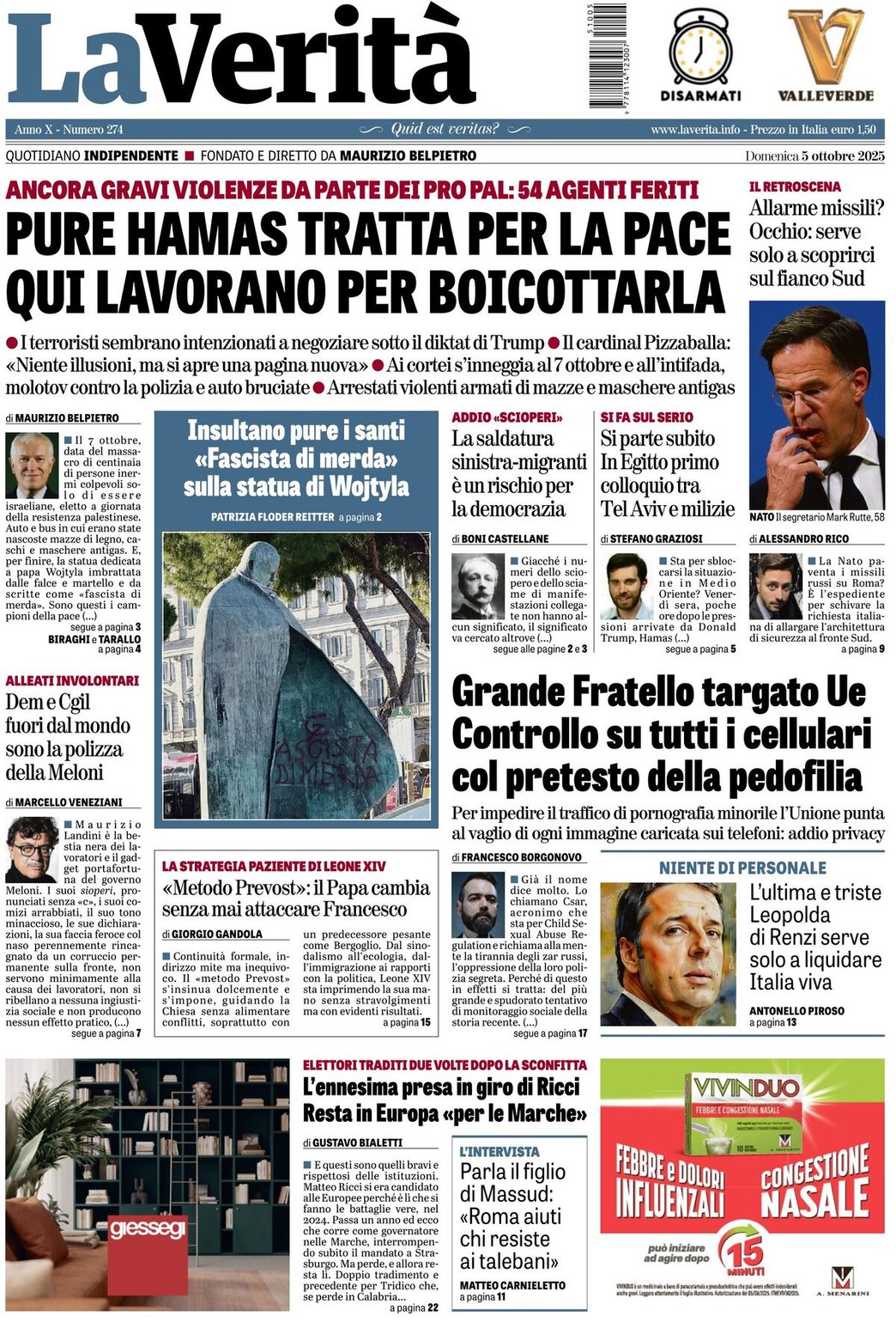 I Titoli Principali da La Verita di oggi: