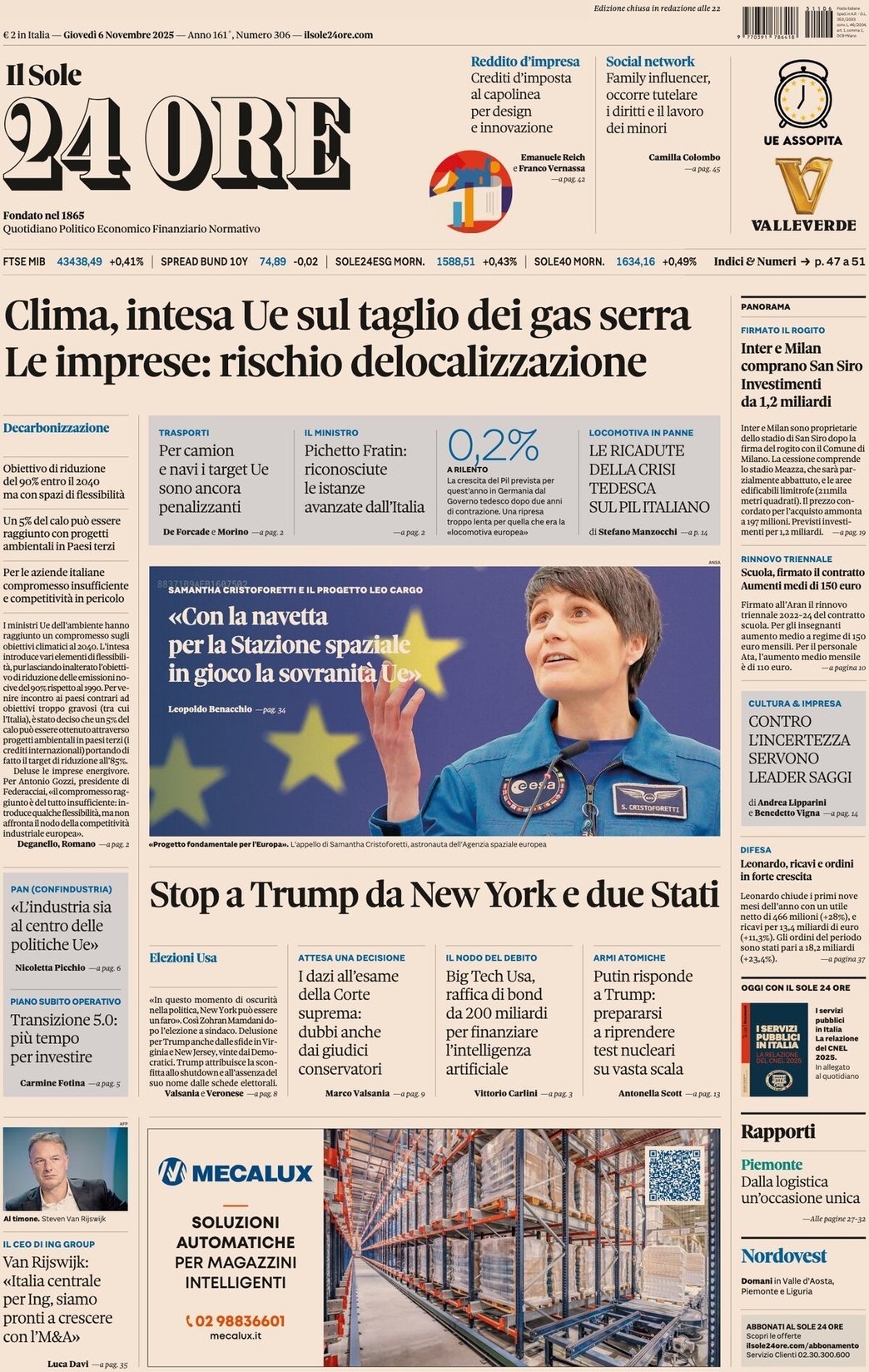 I Titoli Principali da Il Sole 24 Ore di oggi: