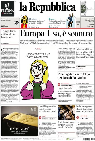 La giornata che emerge dalle pagine dei principali quotidiani italiani è dominata da un clima di tensione crescente sul piano internazionale, con l’Europa e gli Stati Uniti protagonisti di un confronto serrato che si riflette in ambito politico, economico e militare. Le cronache riportano uno scenario di scontro aperto tra Bruxelles e Washington, con Elon Musk che rilancia un messaggio simbolico di rottura, chiedendo di “abolire” l’Europa, e la comunità europea che con fermezza rivendica la propria autonomia decisionale sulle regole interne. Sul fronte della sicurezza, le notizie dal fronte ucraino si fanno drammatiche, mentre continuano i raid di droni e missile e si delineano strategie difensive e offensive con il coinvolgimento diretto di alleati occidentali.