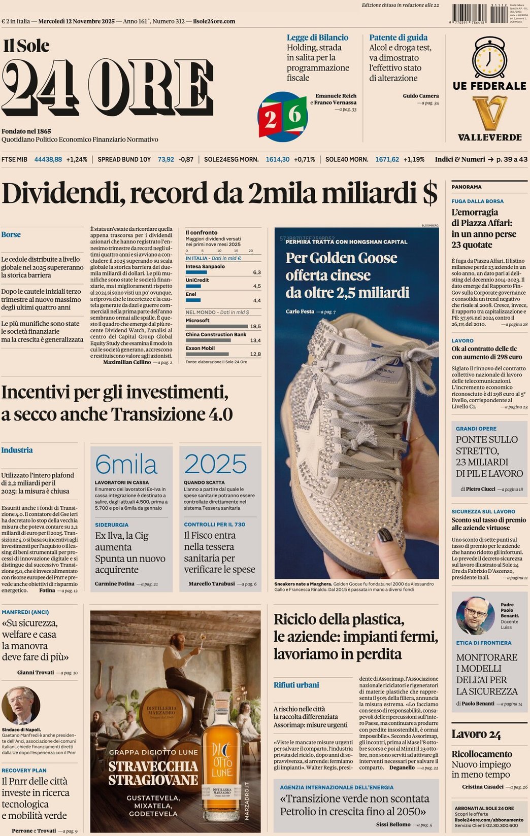 I Titoli Principali da Il Sole 24 Ore di oggi: