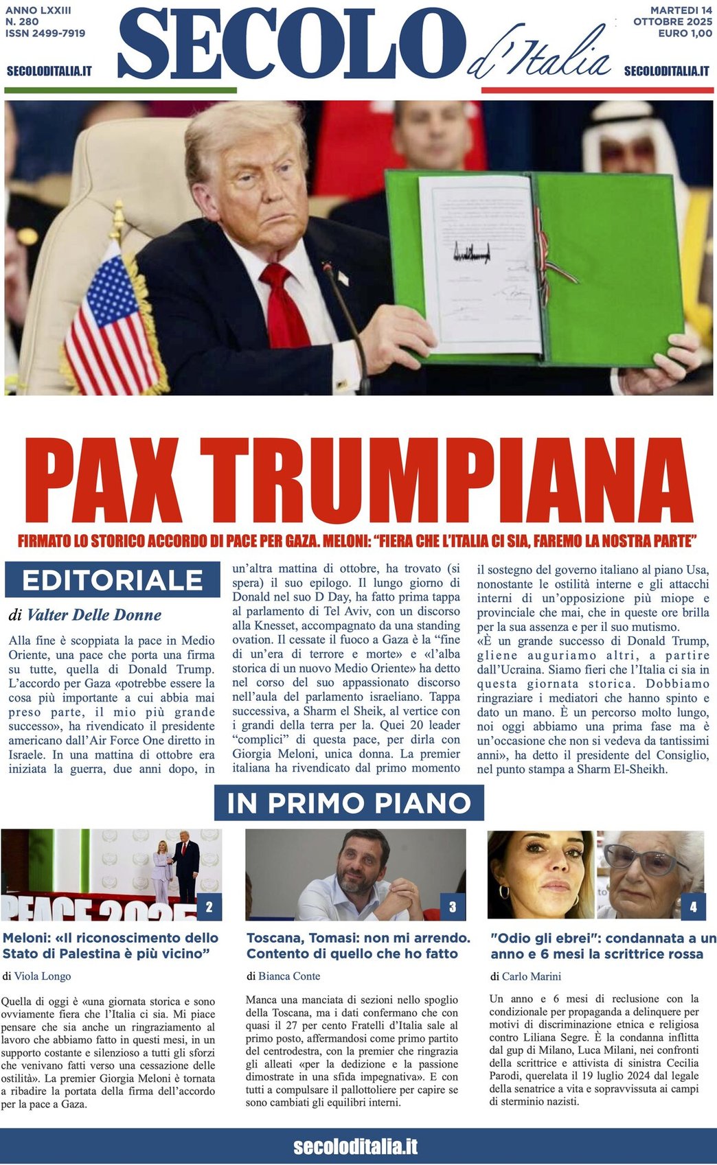 - PAX TRUMPIANA - Firmato lo storico accordo di pace per Gaza. Meloni: “Fiera che l’Italia ci sia, faremo la nostra parte”