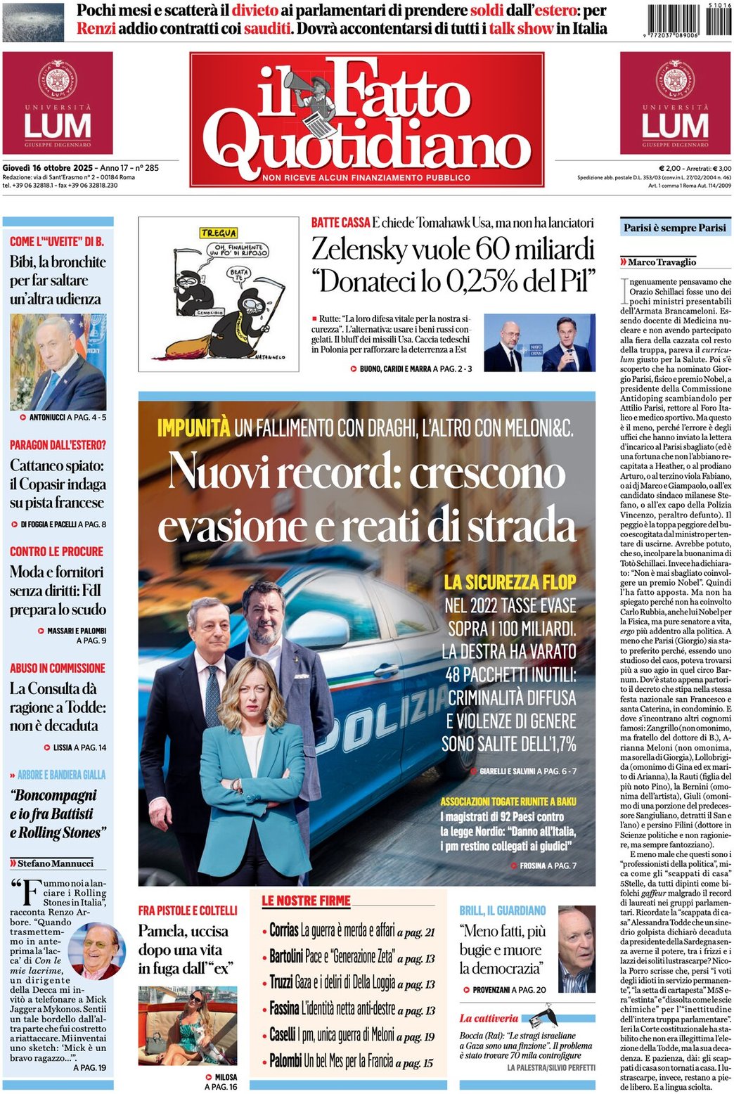 I Titoli Principali da Il Fatto Quotidiano di oggi: