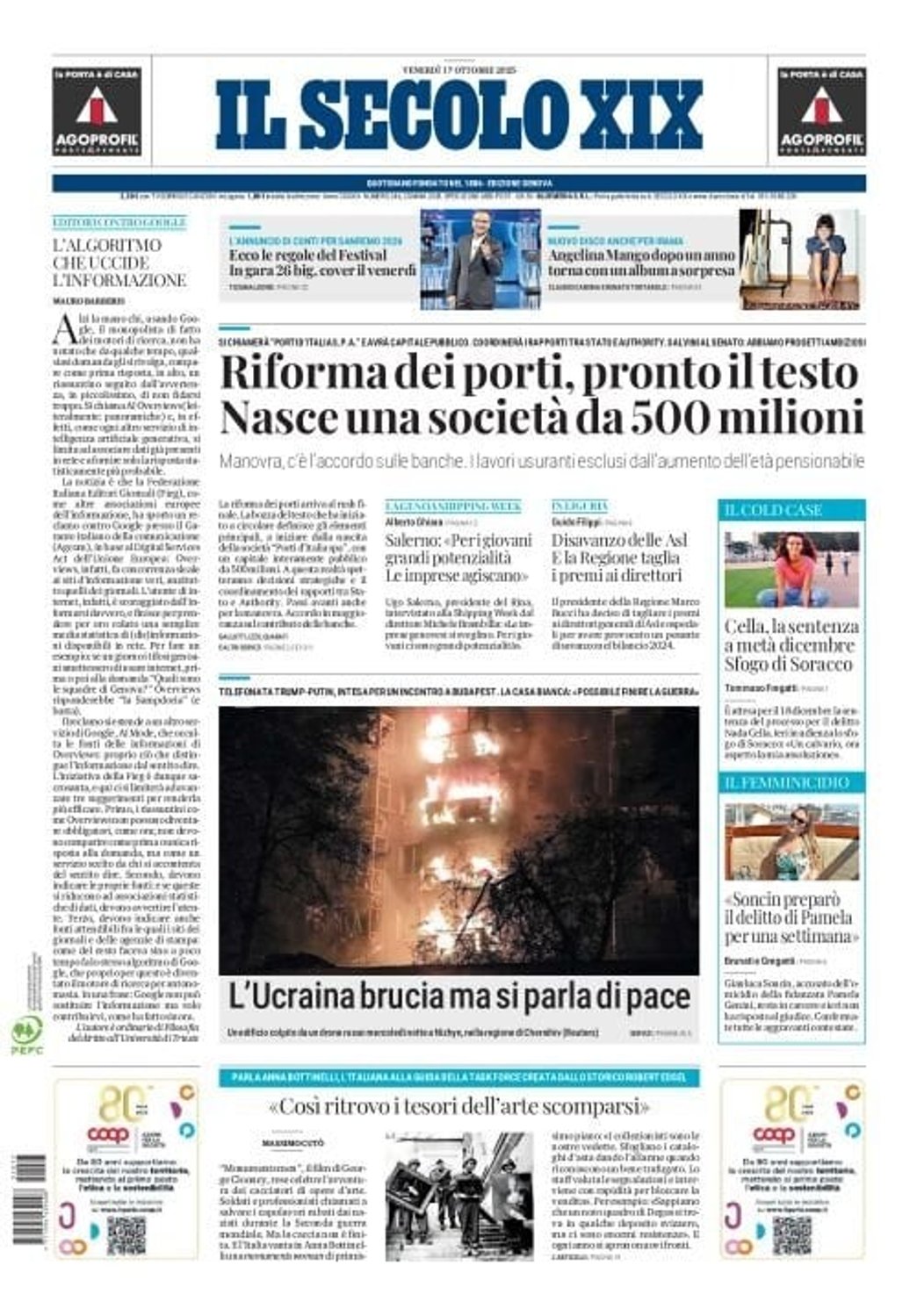 Prima Pagina Il Secolo Xix di oggi, Venerdì 17 Ottobre 2025