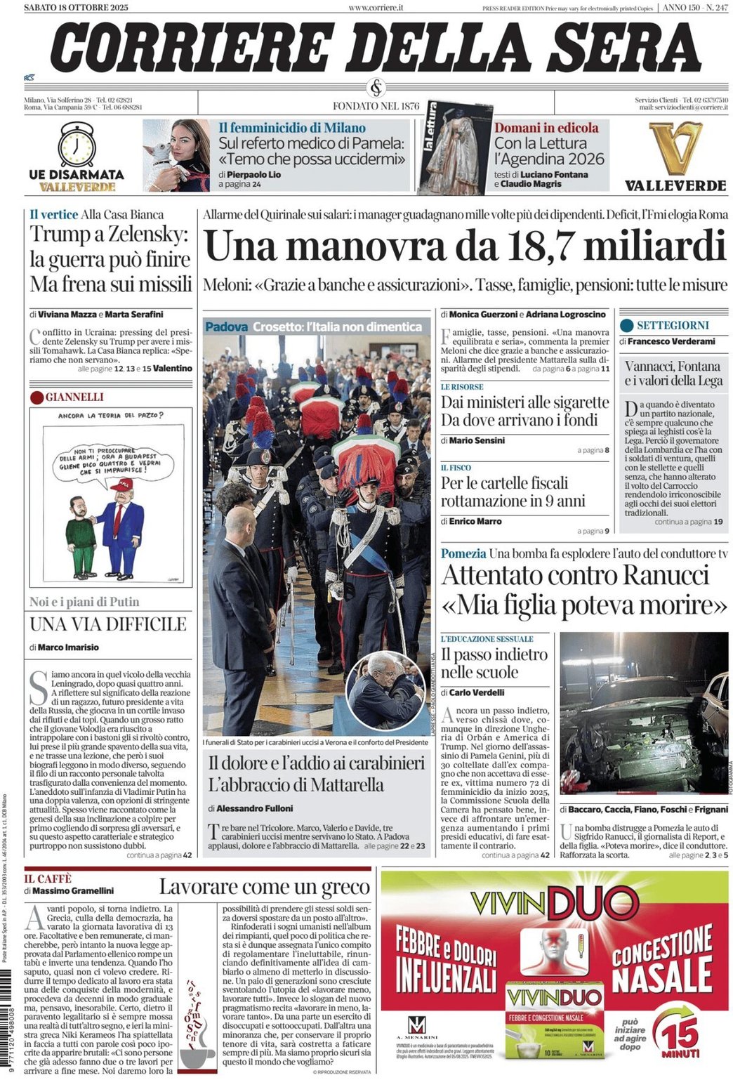 I Titoli Principali da Corriere della Sera di oggi: