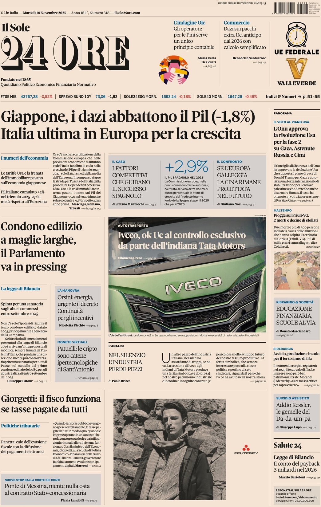 I Titoli Principali da Il Sole 24 Ore di oggi: