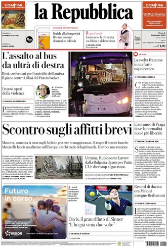 La giornata dei quotidiani italiani si apre sotto il segno di un’escalation di tensioni e contrasti che attraversano il Paese e il contesto internazionale. A Rieti, la cronaca nera torna protagonista con l’assalto violento di ultras di destra che ha portato all’omicidio di un autista, un episodio che scuote la società e che vede già tre fermati. Accanto a questa tragedia, si dipanano le fibrillazioni politiche e sociali, a partire dalle proteste in maggioranza per l’aumento della tassa sugli affitti brevi nell’ambito della manovra economica, uno scontro che riflette le tensioni interne al governo e le resistenze di diversi settori economici.