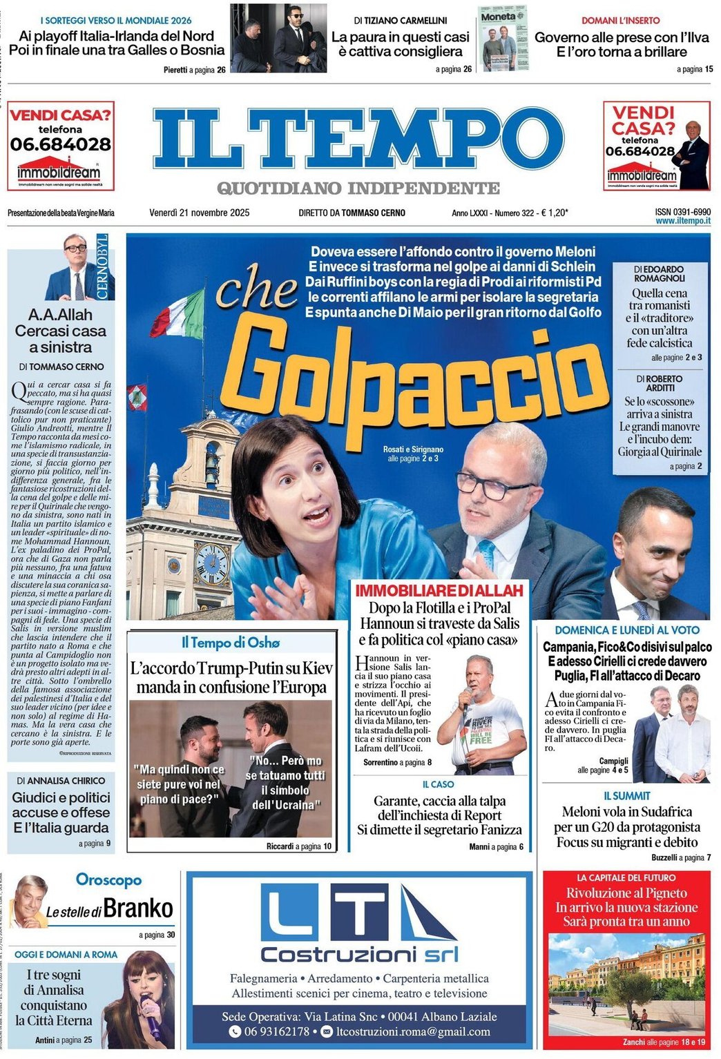 I Titoli Principali da Il Tempo di oggi: