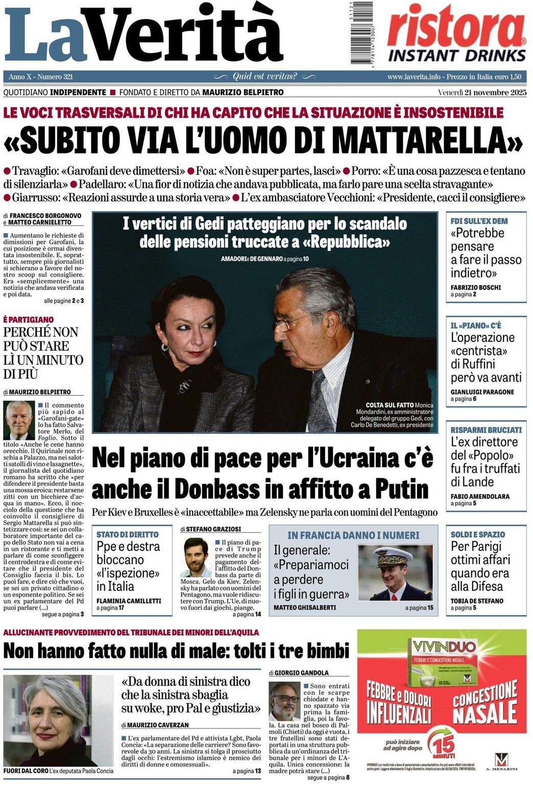 I Titoli Principali da La Verita di oggi: