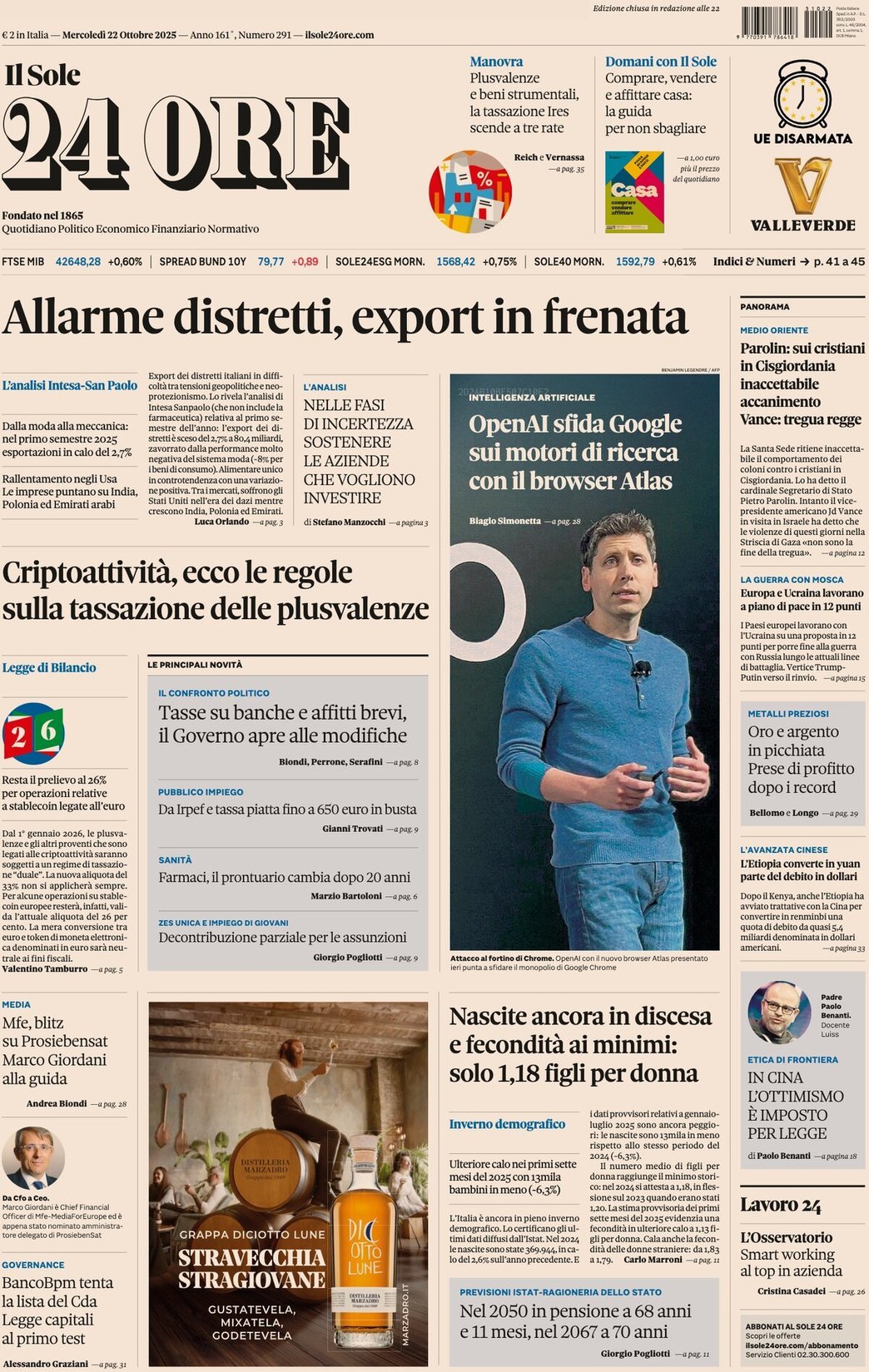 I Titoli Principali da Il Sole 24 Ore di oggi: