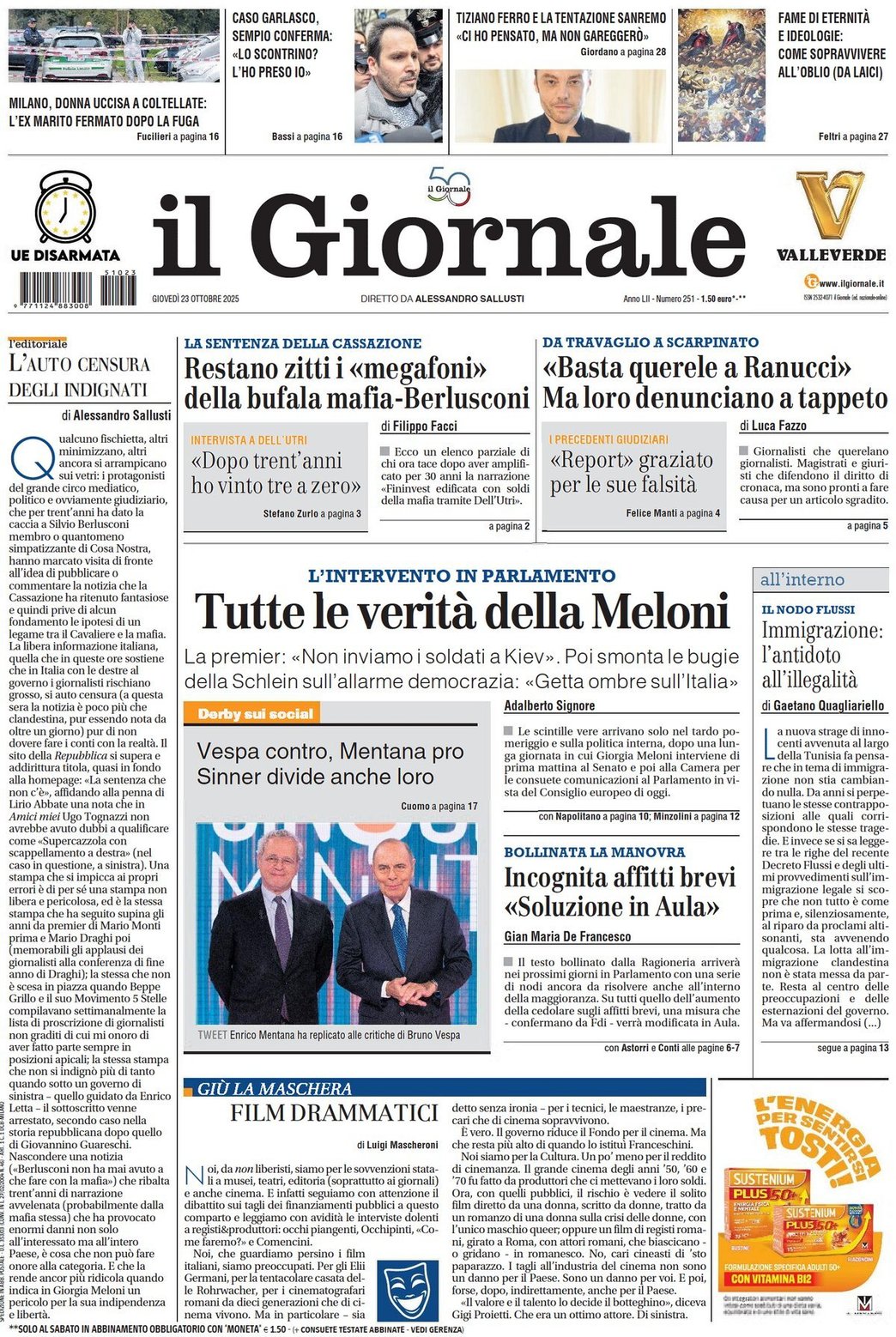 I Titoli Principali da Il Giornale di oggi: