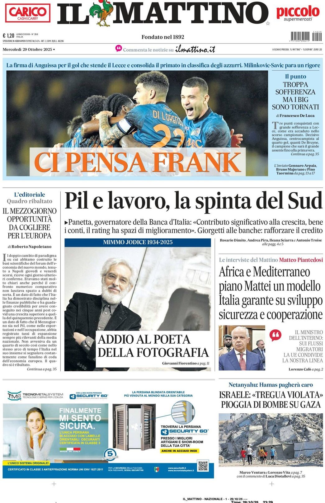- Pil e lavoro, la spinta del Sud - Panetta, governatore della Banca d’Italia: 'Contributo significativo alla crescita, bene i conti, il rating ha spazi di miglioramento.' – Roberto Napoletano