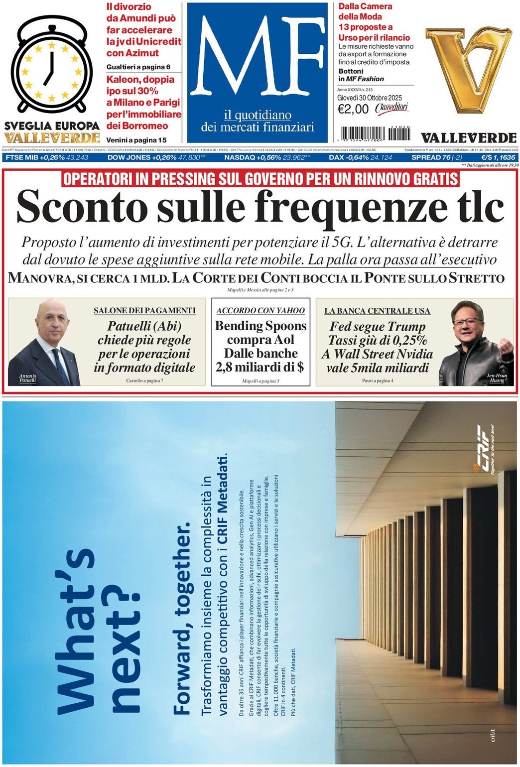 - Sconto sulle frequenze tlc - Proposta l’aumento di investimenti per potenziare il 5G. L’alternativa è detrarre dal dovuto le spese aggiuntive sulla rete mobile. La palla ora passa all’esecutivo Manovra, si cerca 1 mld. La Corte dei Conti boccia il Ponte sullo Stretto