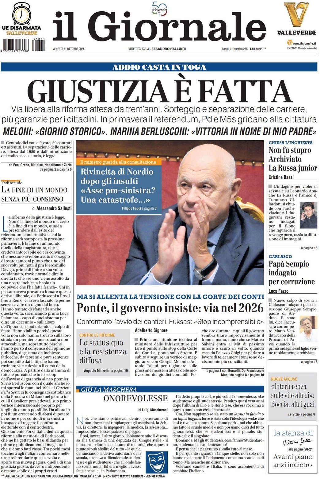 - Via libera alla riforma attesa da Trent’anni. Sorteggio e separazione delle carriere, più garanzie per i cittadini. In primavera il referendum, Pd e M5S gridano alla dittatura - MELONI: «GIORNO STORICO», MARINA BERLUSCONI: «VITTORIA IN NOME DI MIO PADRE»