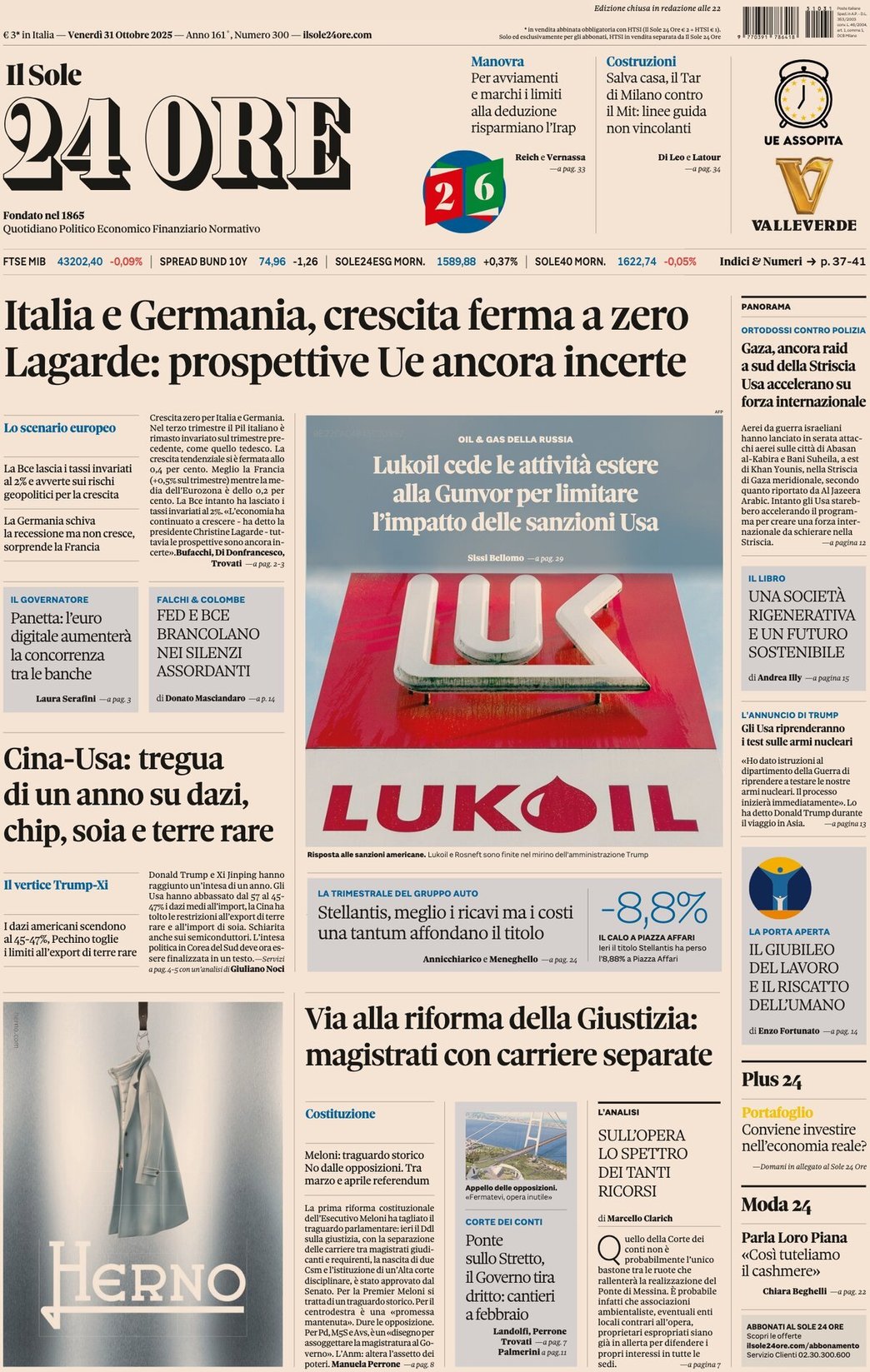 I Titoli Principali da Il Sole 24 Ore di oggi: